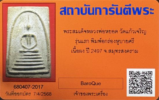 พระสมเด็จหลวงพ่อหยอด วัดแก้วเจริญ รุ่นแรก ปี 2497 สภาพสวยสมบูรณ์ เดิมๆ ไม่มีหักซ่อมอุดหยอดใดๆ เนื้อจัดๆ ด้านหลังมีจาร มาพร้อมบัตรรับรองพระแท้จากเว็บการันตีพระครับ |