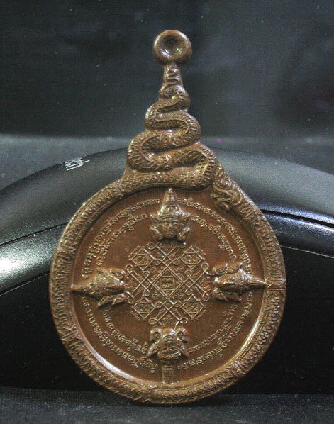ด้านหน้าเหรียญได้นำพระยันต์ของพระพรหมที่เป็นตำรับเก่าแก่เป็นผูกกระดาษฝาง ที่ตกทอดกันมา ในตำราบอกบรรยายไว้มากมายสรุปได้อย่างนี้ว่า "ยันต์นี้ให้อธิษฐานตามแต่เธอจะปรารถนา จะคิดการสิ่งใด ก็สำเร็จเลิศเลอ ประเสริฐ ยิ่งนักแล" มีพญานาคขดล้อมยันต์พระพรหม ตวัดหางเป็นเลข ๙ เป็นสัญลักษณ์การเป่ายันต์พรหมครั้งที่ 9 ของหลวงพ่อ