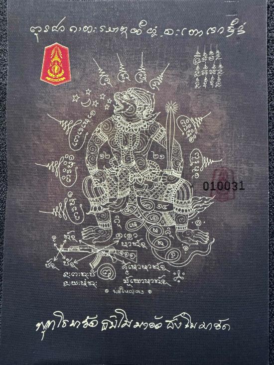 เคาะเดียว 300 ผ้ายันต์พหูรมานสีดำ no.010031แม่ทัพภาคที่2.ทำแจกทหารชายแดนรอบที่2.หลวงปู่เมตตาอฐิฐานจิตเสกเดี่ยวอย่างเข้มขลัง(ผ้าแคนวาสสกรีนตรากองทัพภาคที่2)รันเลขนัมเบอร์พร้อมประทับหมึกเเดงตรากองทัพ |