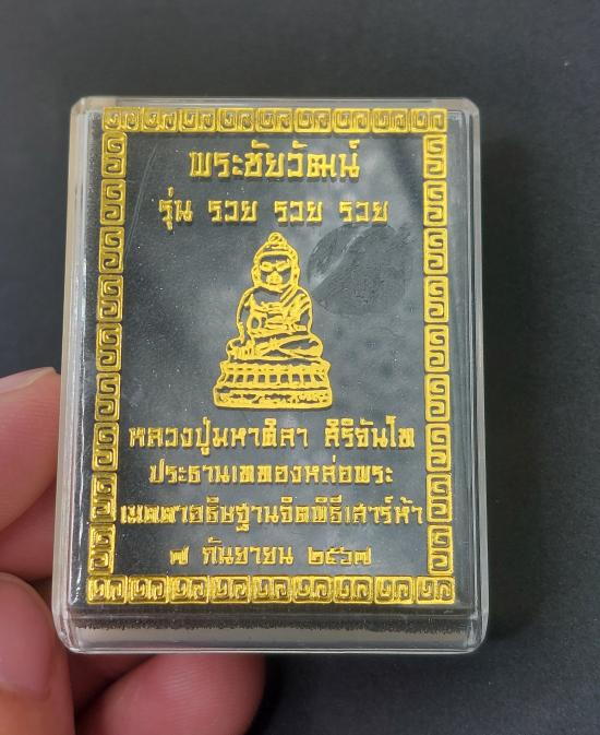 พระชัยวัฒน์ รวย รวย รวย หลวงปู่มหาศิลา หลวงปู่ศิลา สิริจันโท เมตตาตั้งชื่อรุ่นให้ และ ปลุกเสก ณ ธรรมอุทยานหลวงปู่ศิลา จ.กาฬสินธุ์ เนื้อสัมฤทธิ์ ฝังมวลสารตะกรุดสามกษัตริย์ เลข ๒๔๑๒ มีกล่อง |