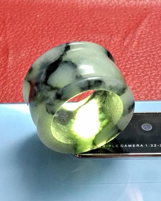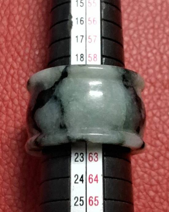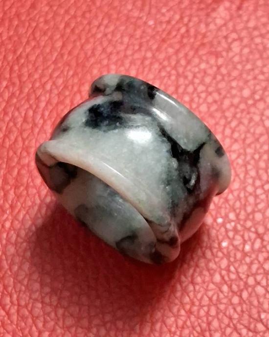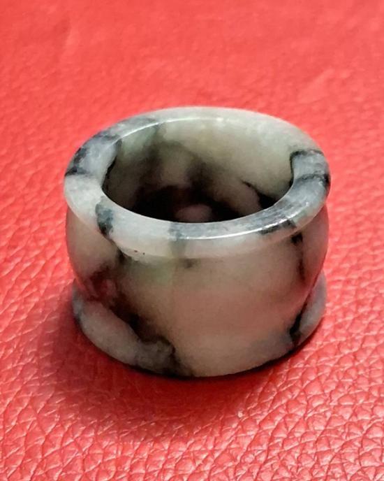 แหวนหยกจักรพรรดิ์ หยกพม่าแท้ 100 % (แสงส่องผ่าน) สีเทาปนดำ เหมือนลายทหาร กำลังนิยม สวยธรรมชาติ สวยมากๆ เส้นผ่าศูนย์กลาง 2.0 ซม. หนา 1.6 ซม. หายาก (กท.80) |