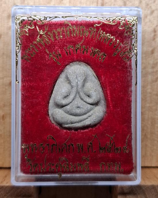 พระปิดตามหาเสน่ห์หลวงปู่โต๊ะ รุ่นเกศมงคล ปี 2524 เนื้อผง หลังยันต์นะมหาเศรษฐี วัดประดู่ฉิมพลี กรุงเทพฯ กล่องเดิม มวลสารเข้ม มีเส้นเกศาปรากฎในองค์พระ พระสวยมาก |