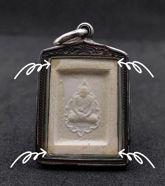ตรงมุมทั้ง4มุมน่าจะเป็นคราบกาว พระไม่บิ่นนะครับ