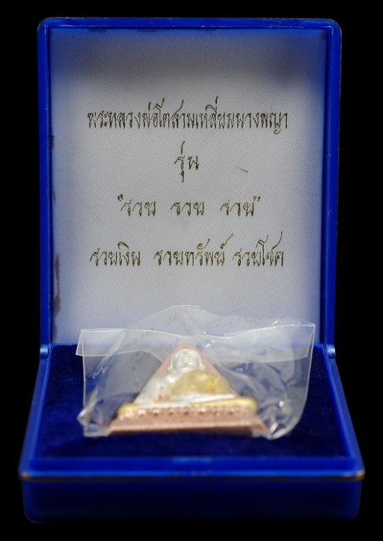 เคาะเดียว +++++ หลวงพ่อโต วัดบางพลีใหญ่ใน พิมพ์สามเหลี่ยม รุ่น รวย รวย รวย เนื้อเงินชุบสามกษัตริย์ พิมพ์ใหญ่ กล่องเดิม |