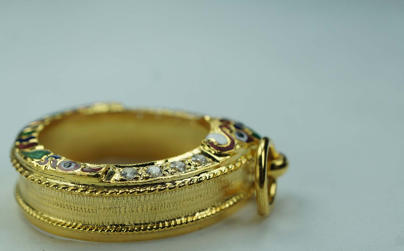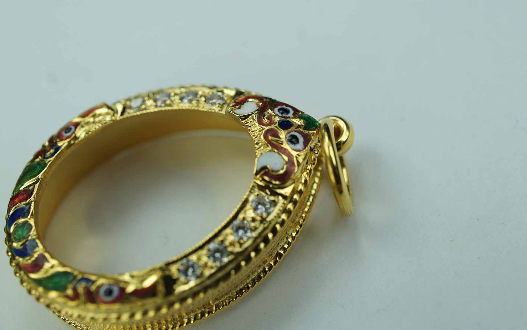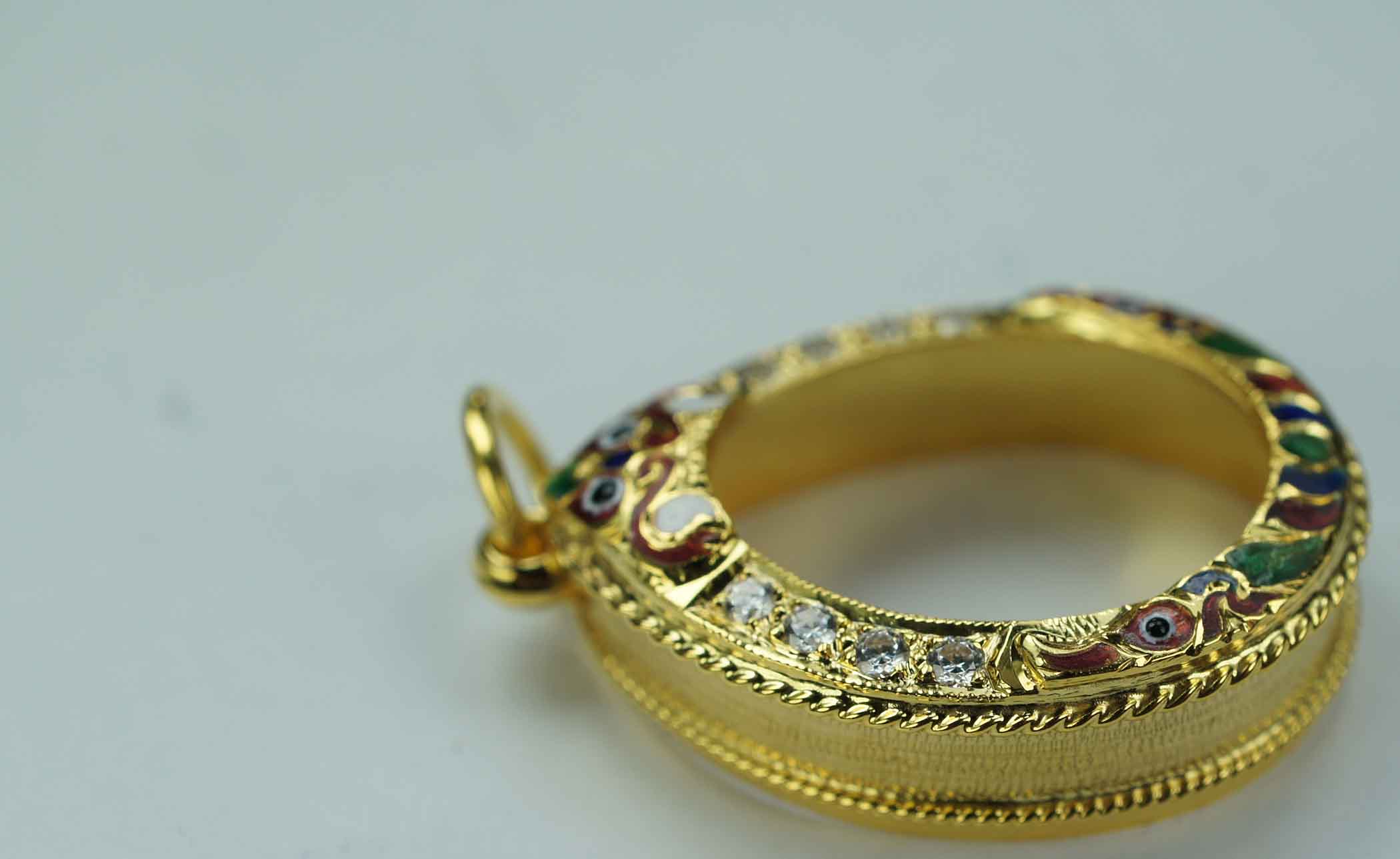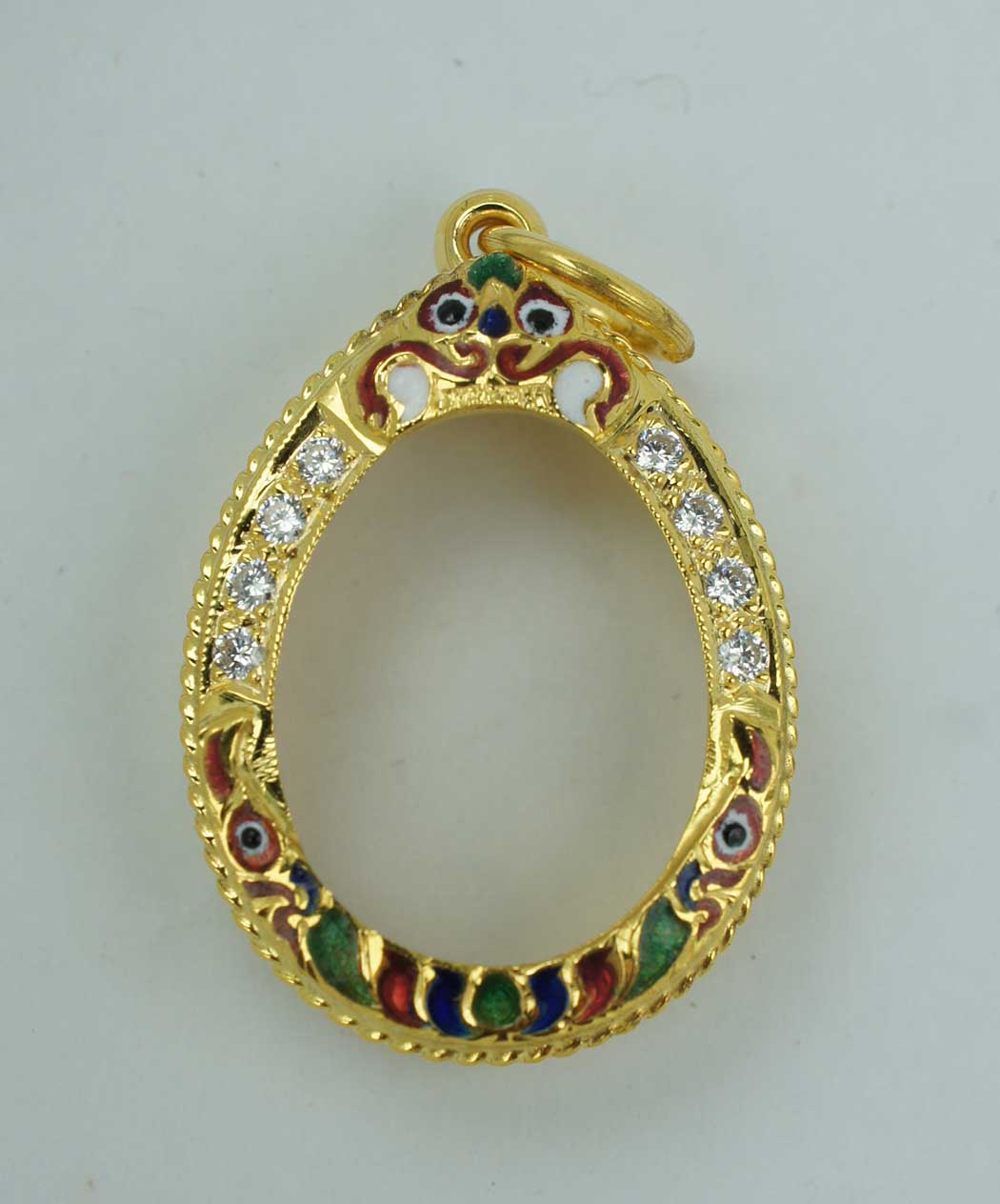 กรอบทองคำ ล้อมเพชร CZ ลงยา ข้างเกลียวโปเต้ ใส่เหรียญเม็ดแตงปู่ทวด **ขนาด วัดจากขอบใน สูง 1.8 ซม. กว้าง 1.4 ซม. หรือไซด์ไกล้เคียง ( ฝังเพชร CZ 8 เม็ด **ตรง Size** ) งานขึ้นมือ น้ำหนัก 3.35 กรัม เปอร์เซ |