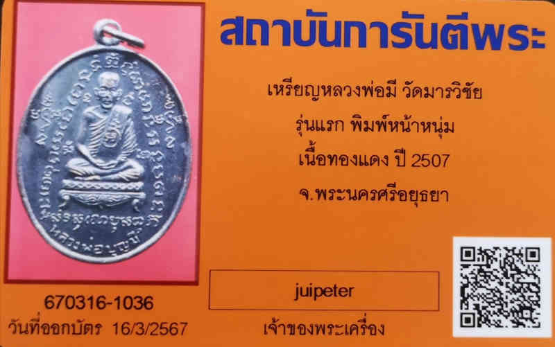 เหรียญหลวงพ่อมี วัดมารวิชัย รุ่นแรก พิมพ์หน้าหนุ่ม เนื้อทองแดง ปี 2507 จ.พระนครศรีอยุธยา สภาพสวย พร้อมบัตรรับรองพระแท้ |