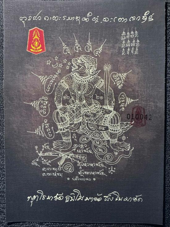 เคาะเดียว 300 ผ้ายันต์พหูรมานสีขาว no.010042 แม่ทัพภาคที่2.ทำแจกทหารชายแดนรอบที่2.หลวงปู่เมตตาอฐิฐานจิตเสกเดี่ยวอย่างเข้มขลัง(ผ้าแคนวาสสกรีนตรากองทัพภาคที่2)รันเลขนัมเบอร์พร้อมประทับหมึกเเดงตรากองทัพ |