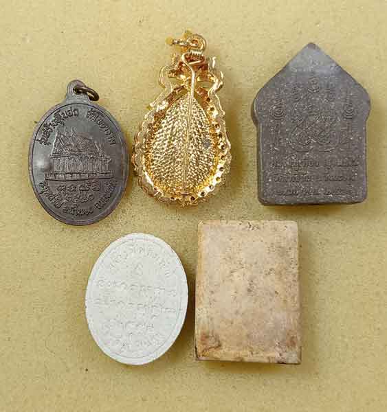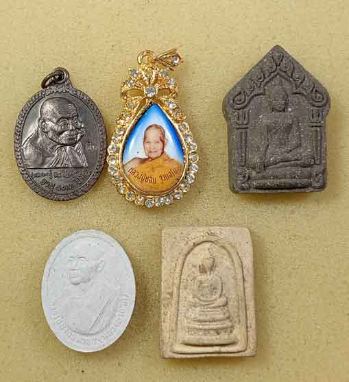 เหรียญหลวงปู่หิน วัดโพธาราม ขอนแก่น + ล๊อกเก็ตเข็มกลัด หลวงปู่ชอบ + ขุนแผนหลวงปู่เทือง วัดโพธิ์ชัย เลย + พระผงหลวงต่คำดี สกลนคร+ สมเด็จหลวงปู่จันทร์ วัดศรีเทพ |