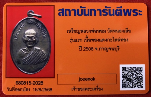 เหรียญหลวงพ่อหอม วัดหนองเสือ ( รุ่นแรก ) เนื้อทองแดงกะไหล่ทอง ( มีจาร หน้า-หลัง ) จำนวนการสร้างแค่ 500 เหรียญ ปี 2508 จ.กาญจนบุรี สวยเดิม มาพร้อมบัตรรับรองครับ |