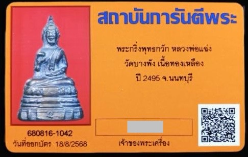 พระกริ่งพุทธกวัก หลวงพ่อแฉ่ง วัดบางพัง เนื้อทองเหลือง ปี 2495 พร้อมบัตรรับรอง ค่ะ