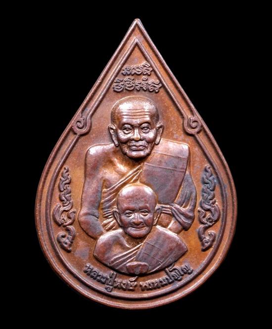 เหรียญหยดน้ำพุทธซ้อน สองพระมหาโพธิสัตว์ หลวงปู่หงษ์ - หลวงปู่ทวด รุ่น"เสาร์ 5 มหาบารมี" ปี2543 หลวงปู่หงษ์ พรหมปัญโญ สุสานทุ่งมน จ.สุรินทร์ แดงเคาะแรก