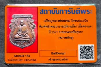 เหรียญหลวงพ่อพรหม วัดขนอนเหนือ พิมพ์หลังพระนารายณ์ทรงเมือง เนื้อทองแดง ปี 2521