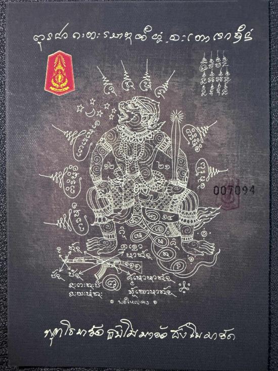 เคาะเดียว 300 ผ้ายันต์พหูรมานสีดำ no.007094 แม่ทัพภาคที่2.ทำแจกทหารชายแดนรอบที่2.หลวงปู่เมตตาอฐิฐานจิตเสกเดี่ยวอย่างเข้มขลัง(ผ้าแคนวาสสกรีนตรากองทัพภาคที่2)รันเลขนัมเบอร์พร้อมประทับหมึกเเดงตรากองทัพ |