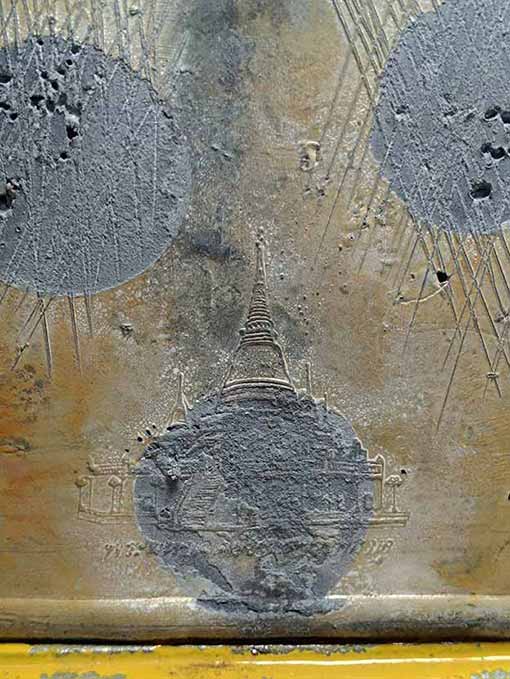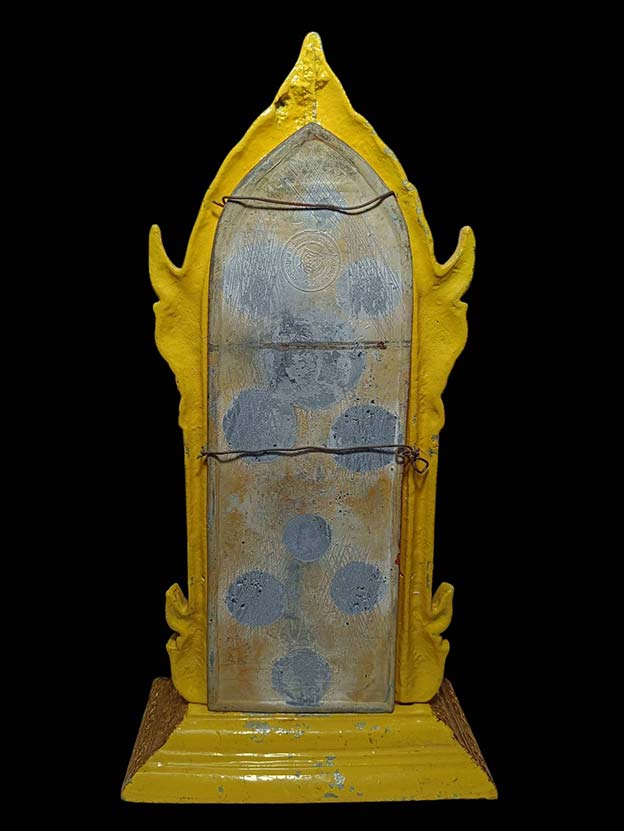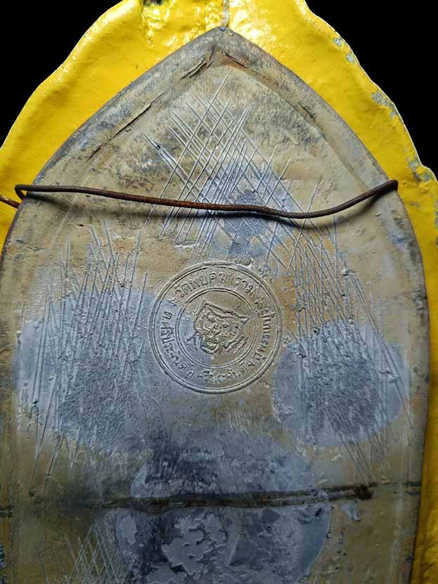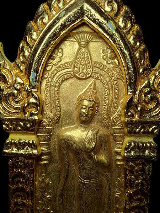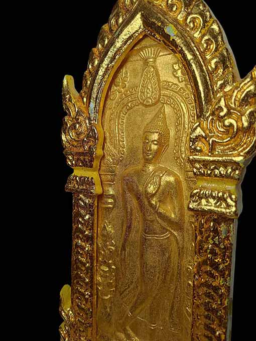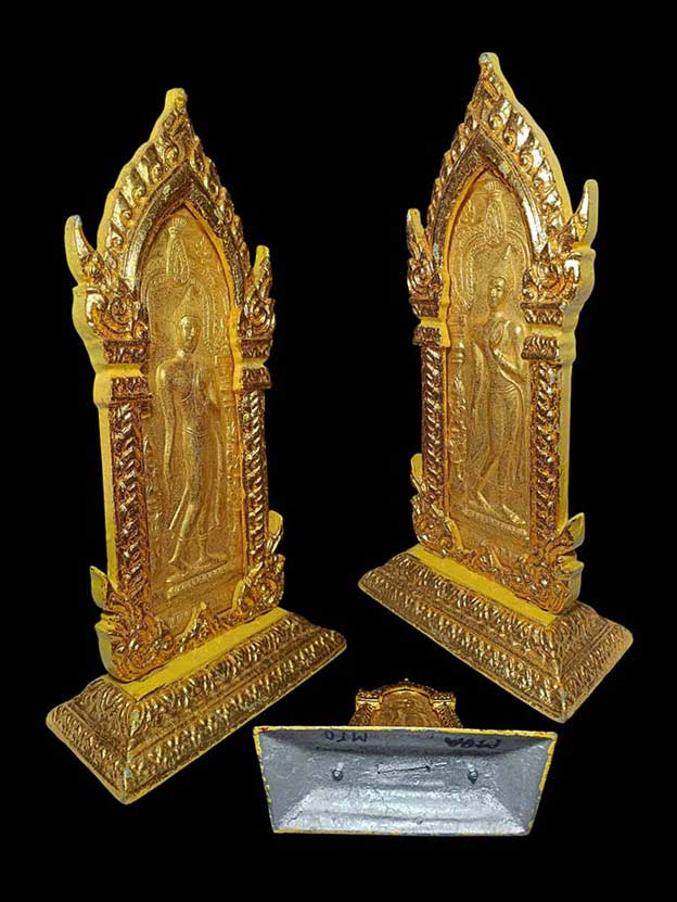 พระลีลากำแพงศอก+ซุ้ม วัดพยัคฆาราม จ.สุพรรณบุรี เนื้อโลหะชินตะกั่ว ด้านหน้าองค์พระและซุ้มปิดแผ่นทองคำแท้ทั่วทั้งองค์ เหลืองอร่าม งดงามมาก วัดขนาดที่ฐาน 20 ซม. x สูงรวม 38 ซม. ขนาดใหญ่น้ำหนักมาก พระหล่อได้สวยสมบูรณ์ จมูกโด่งๆหายาก |
