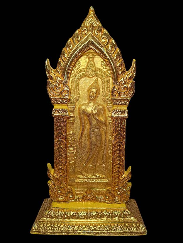 พระลีลากำแพงศอก+ซุ้ม วัดพยัคฆาราม จ.สุพรรณบุรี เนื้อโลหะชินตะกั่ว ด้านหน้าองค์พระและซุ้มปิดแผ่นทองคำแท้ทั่วทั้งองค์ เหลืองอร่าม งดงามมาก วัดขนาดที่ฐาน 20 ซม. x สูงรวม 38 ซม. พระสวย จมูกโด่ง |