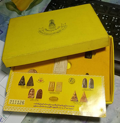 259.........วัดใจเคาะแรก........พระชุดเบญจภาคี ภ.ป.ร.เฉลิมพระเกียรติ ฉลองสิริราชสมบัติ 60 ปี สร้างวิทยาลัยการอาชีพ วังไกลกังวล ..................กล่องผ้าไหม |
