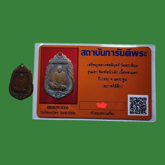 เหรียญรุ่นแรกหลวงพ่ออินทร์ วัดสระสี่มุม นครปฐม พร้อมบัตรรับรอง