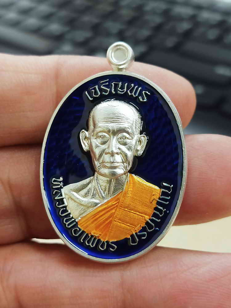 วัดใจ 100 เหรียญเจริญพรบน 6 รอบ หลวงพ่อเพ็ชร วัดประดู่ทรงธรรม จ.อยุธยา 2566 ชุบเงิน ลงยาน้ำเงิน หมายเลข 47 สร้าง 200 เหรียญ กล่องเดิม |