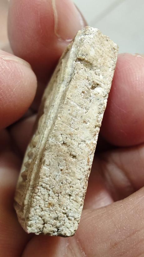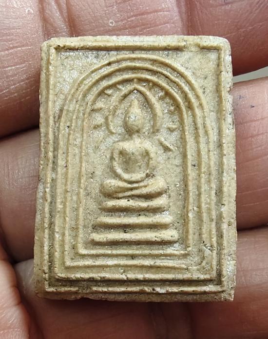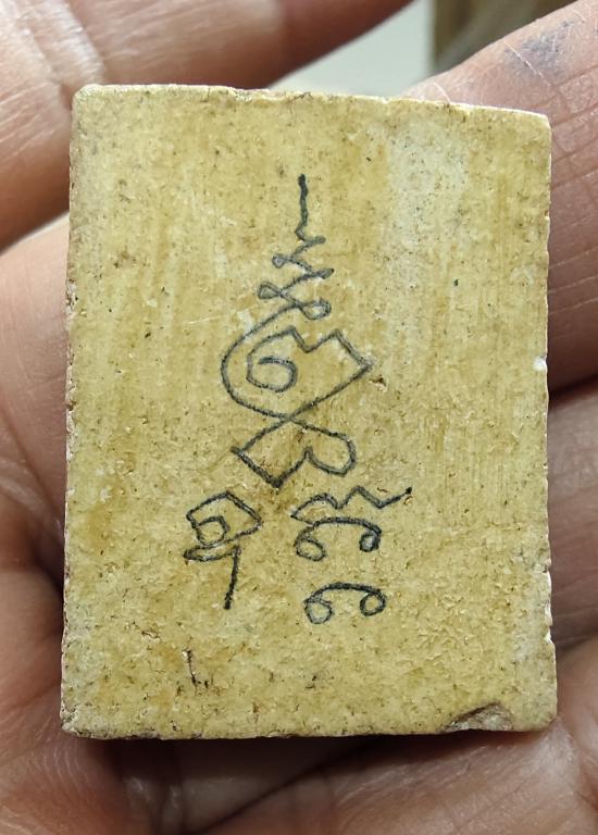 พระเนื้อผงฐานสามชั้น ด้านหลังมีจาร