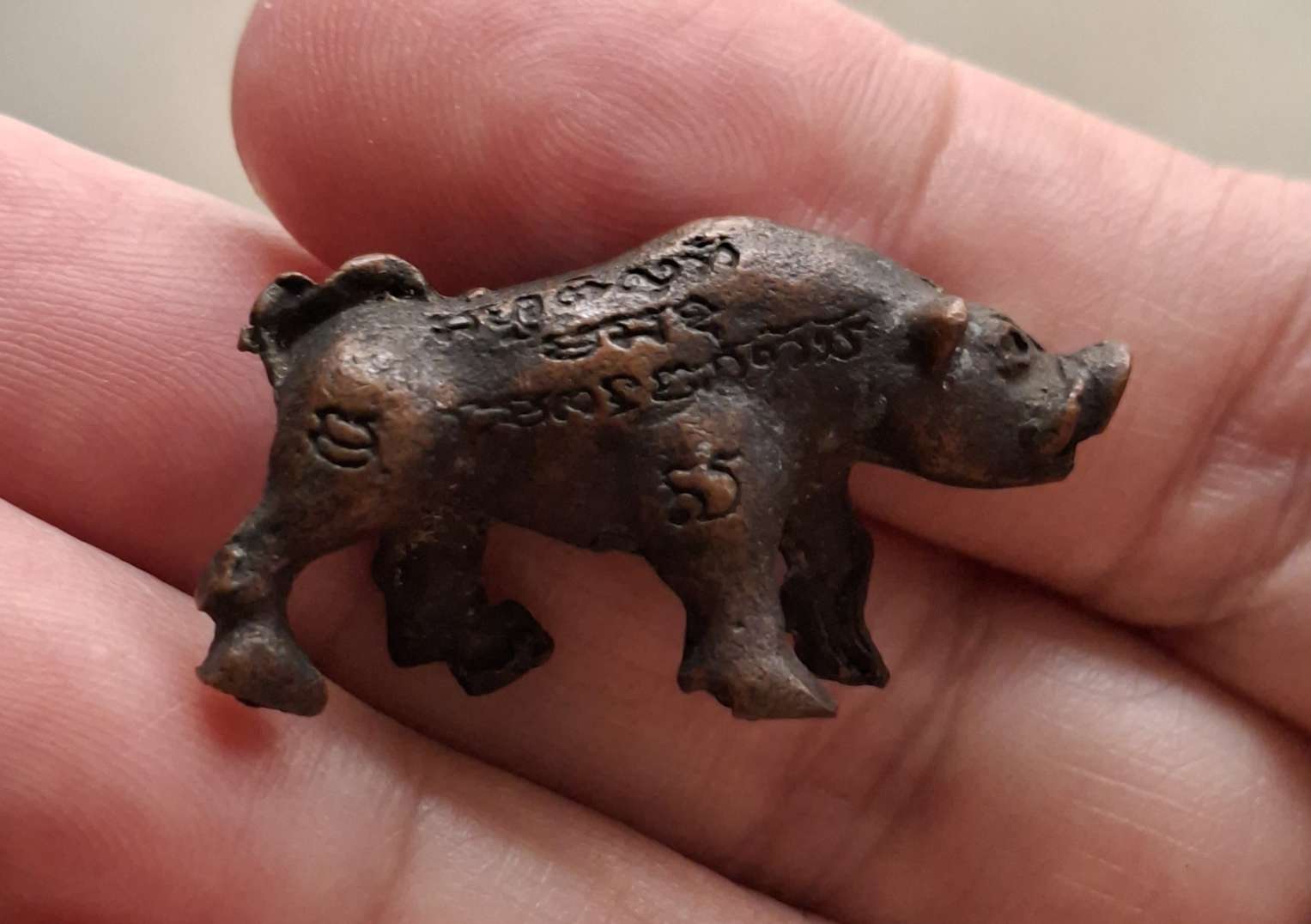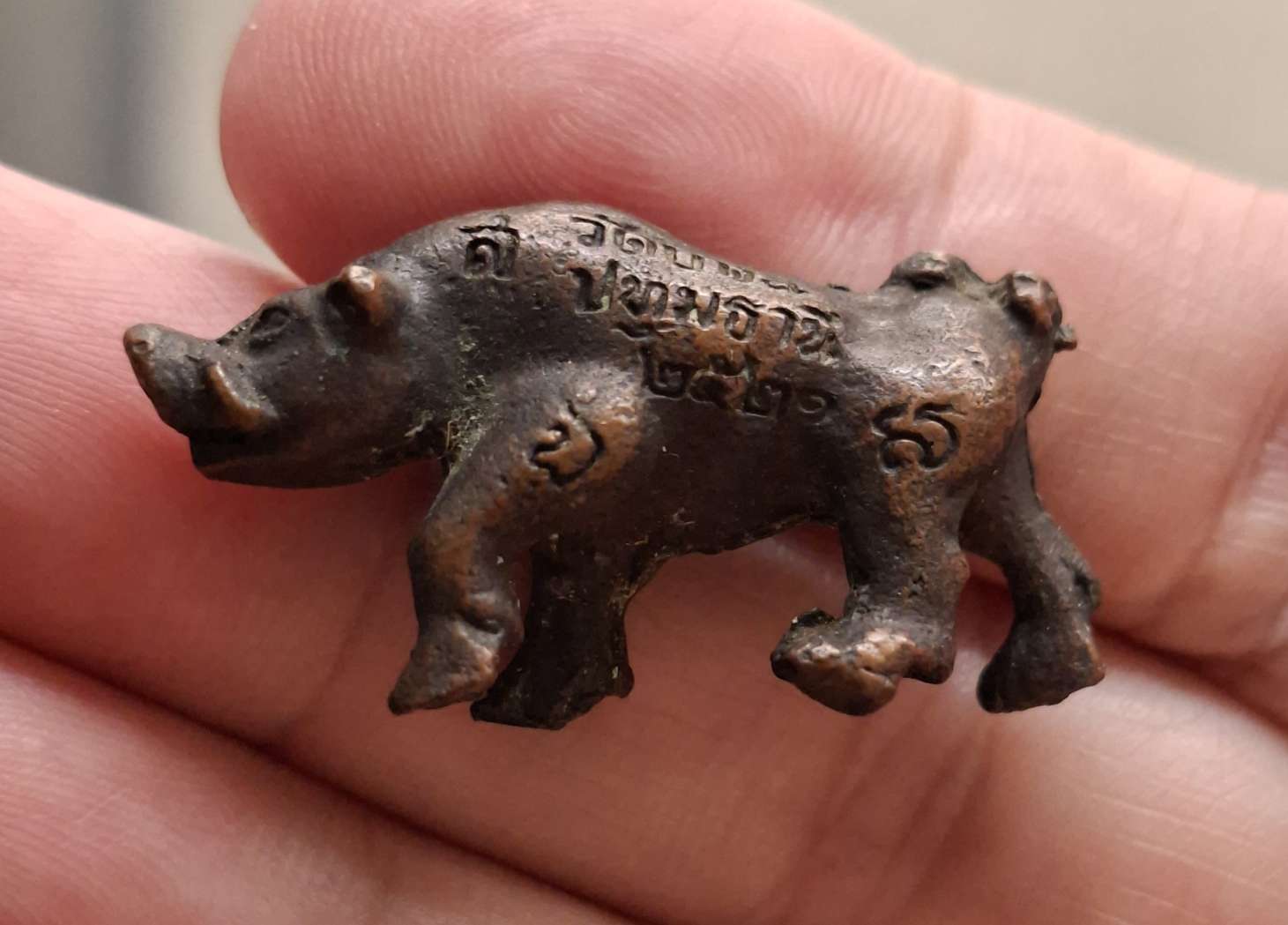 หมูเขี้ยวตัน มหาลาภ สภาพสวยมาก เนื้อตะกั่วอาบทองแดง |