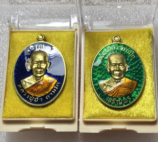 เหรียญเจริญพรบน-ล่าง หลวงปู่บัว ถามโก วัดศรีบุรพาราม จ.ตราด รุ่น เจริญพรมงคลชีวิต ๘๘ เนื้อทองทิพย์ลงยา บน เลข ๑๕๔๖, ล่างเลข ๑๐๕๔ ปี๒๕๕๗ พระสวย มีกล่องเดิม