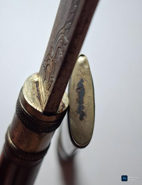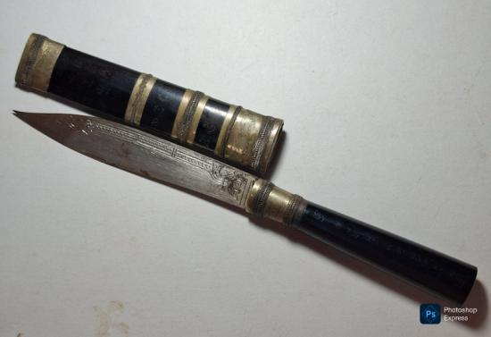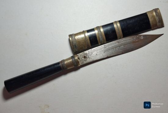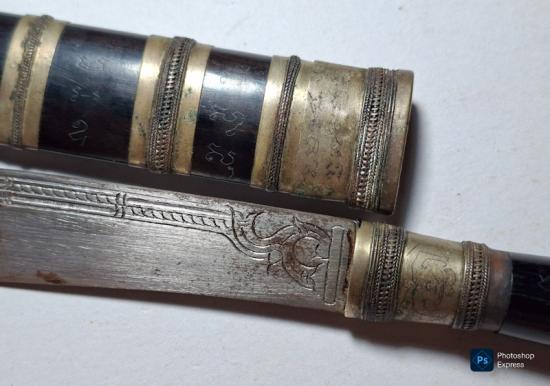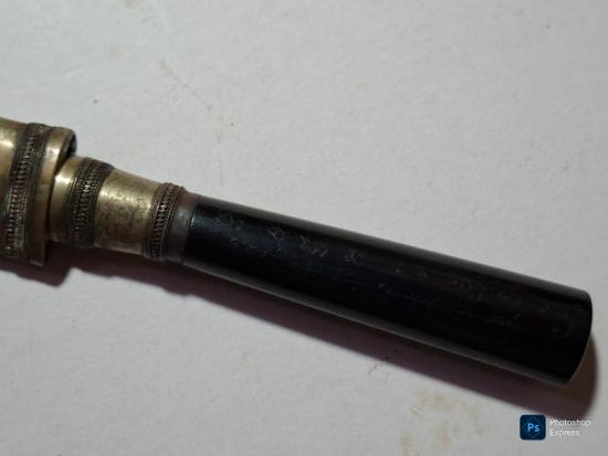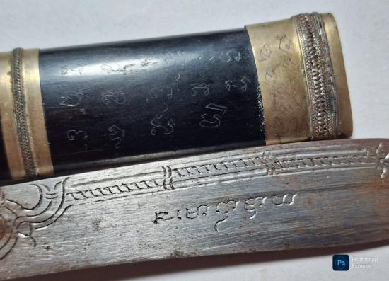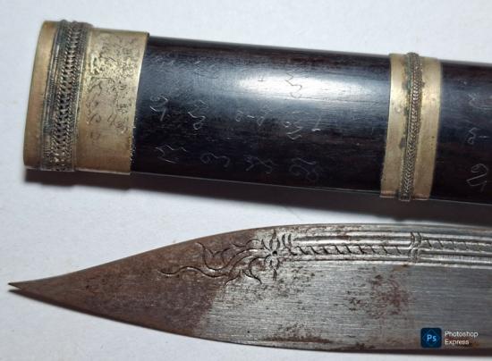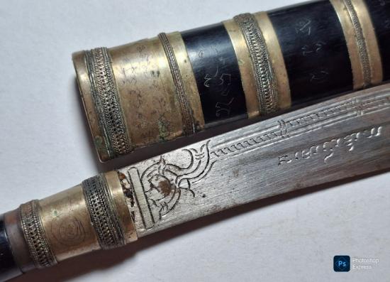 ด้ามไม้ฝักไม้ มีจารเต็มที่ปลอกเเละด้าม ไม่ทราบวัด ความยาวรวมประมาณ 9นิ้วเศษ
