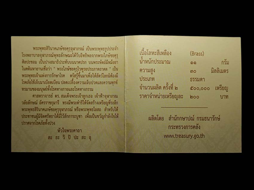 จำนวนการจัดสร้าง เนื้อโลหะสีเหลือง (Brass) นำหนักประมาณ 11 กรัม ความสูง 30 มิลลิเมตร ประเภทธรรมดา จำนวนการผลิต 500,000 เหรียญ ราคาจอง 200 บาท