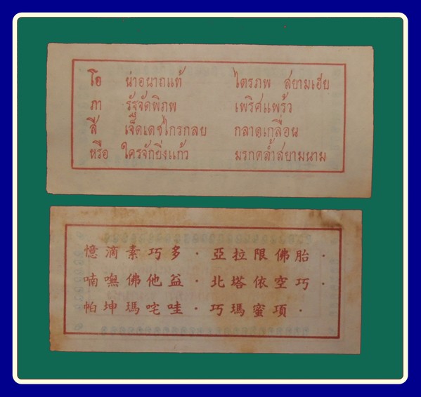เก่าถึงยุค-นิยม 2แบบ หลังภาษาจีน+ภาษาไทย 2แผ่น-150-กระดาษยันต์กันภัย หลวงพ่อโอภาสี ด้านหลังภาษาจีน(หายาก ขนาดประมาณ*9+5 ซม.*) |