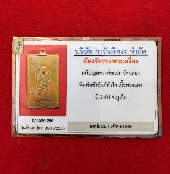 เหรียญหลวงพ่อแช่ม วัดฉลอง พิมพ์หลังยันต์หัวใจ เนื้อทองแดง ปี 2484 (พร้อมบัตรการันตีพระ) |