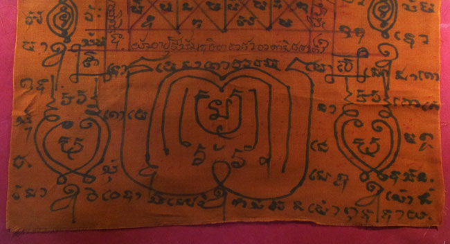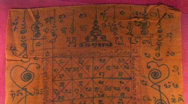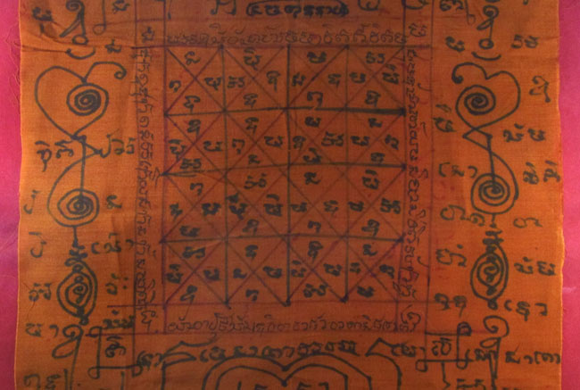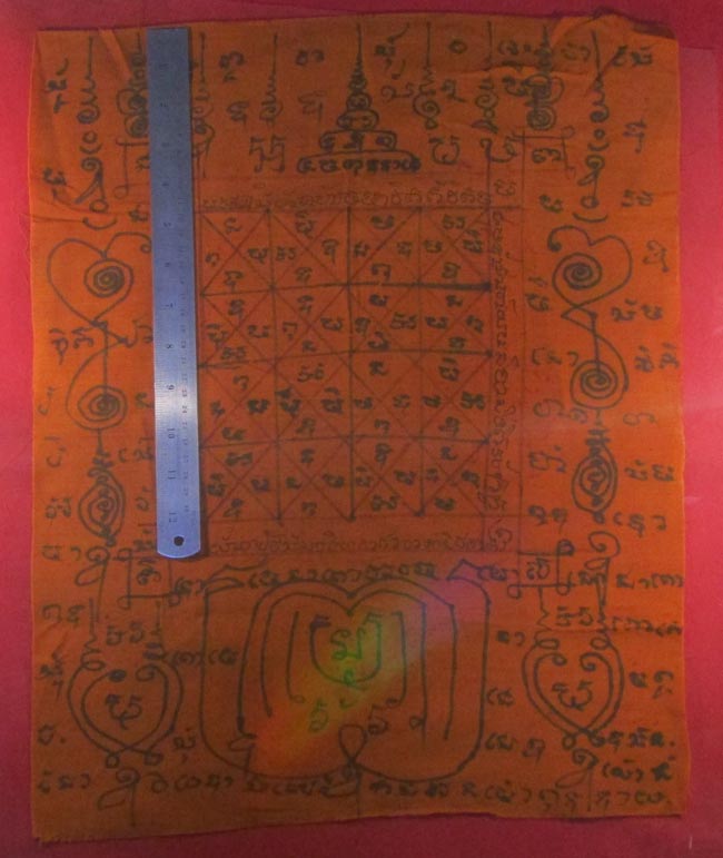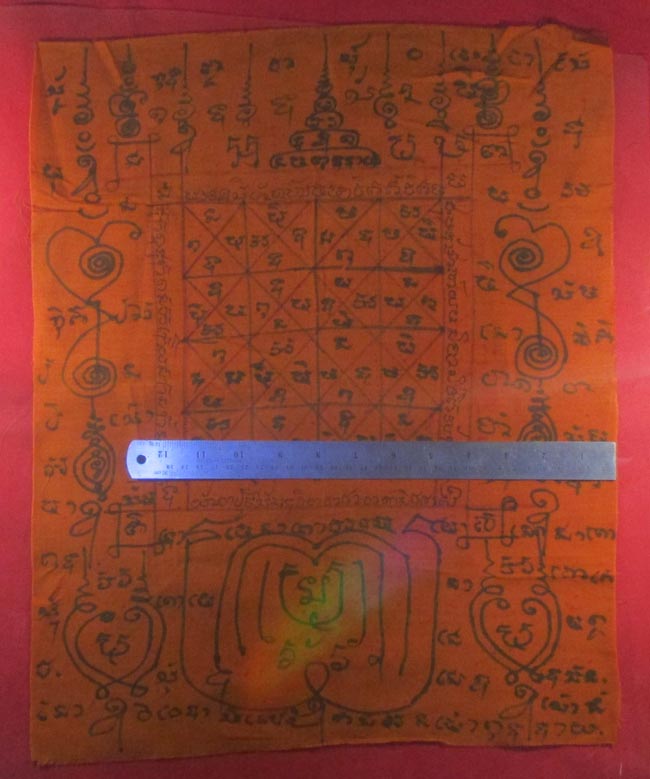 ผ้ายันต์ ไม่ทราบที่ จารยันต์ด้วยมือ เนื้อผ้าจีวร ครับ