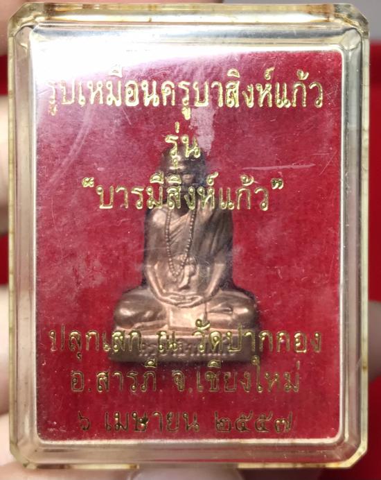 แดงเคาะแรก...รูปหล่อเหมือน ครูบาสิงห์แก้ว วัดปากกอง รุ่นบารมีสิงห์แก้ว ปี 2557 เนื้อทองแดงผิวไฟ หมายเลข 138 ตอกโค้ด พร้อมกล่องเดิมจากวัดครับ |