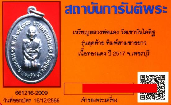 สามชายยาว เหรียญคุกเข่า หลวงพ่อแดง วัดเขาบันไดอิฐ รุ่นสุดท้าย ปี 2517 เนื้อทองแดง มีบัตรรับรอง |