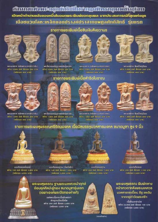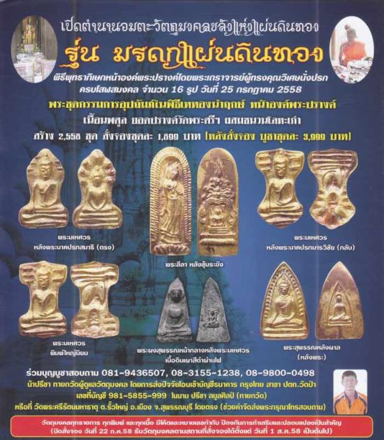 ตำนานแห่งพระกรุที่เปี่ยมด้วยประสบการณ์มากมายจากอดีตถึงปัจจุบัน รุ่นมรดกแผ่นดินทอง มงคลนามของยอดวัตถุมงคลชื่อดัง ปรากฏความล่ำค่าดุจมรดกของขลังแห่งแผ่นดิน พิธีกรรมภาวนาอธิษฐานจิตปรกปลุกเสกและมหาพุทธาภิเษก รวม 3 วาระสำคัญ เพื่อการบูรณะปฏิสังขรณ์กุฏิสงฆ์วัดพระศรีรัตนมหาธาตุ จ.สุพรรณบุรี รายการจัดสร้าง พระมเหศวรพิมพ์ใหญ่นิยม พระมเหศวร หลังพระนาคปรกปางสมาธิ พระมเหศวร หลังพระนาคปรกปางมารวิชัย พระลีลาหลังซุ้มระฆัง พระผงสุพรรณ พิมพ์หน้ากลางเนื้อดินเผา |