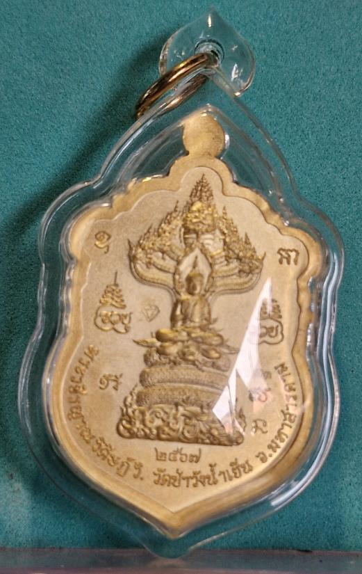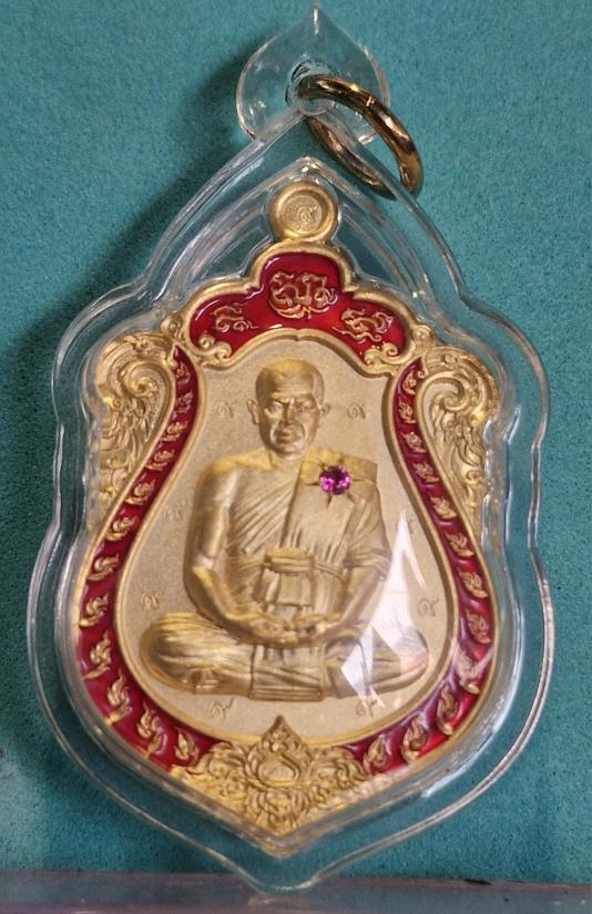 เหรียญเสมา หลวงพ่อสุริยันต์ วัดป่าวังน้ำเย็น เนื้อชุบทอง พ่นทราย ลงยาแดง ฝังพลอย ตอก 9 รอบ |
