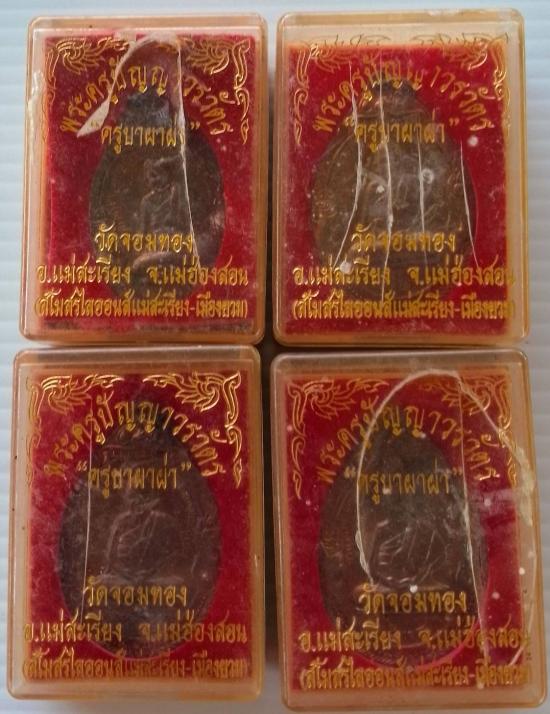เคาะเดียวแดง.....เหรียญครูบาผาผ่า ตนบุญแห่งแม่สะเรียง หลังพระครูบาอินสม วัดจอมทอง แม่สะเรียง จ.แม่ฮ่องสอน พ.ศ. 2538 พร้อมกล่องเดิมจำนวน 4 เหรียญ |