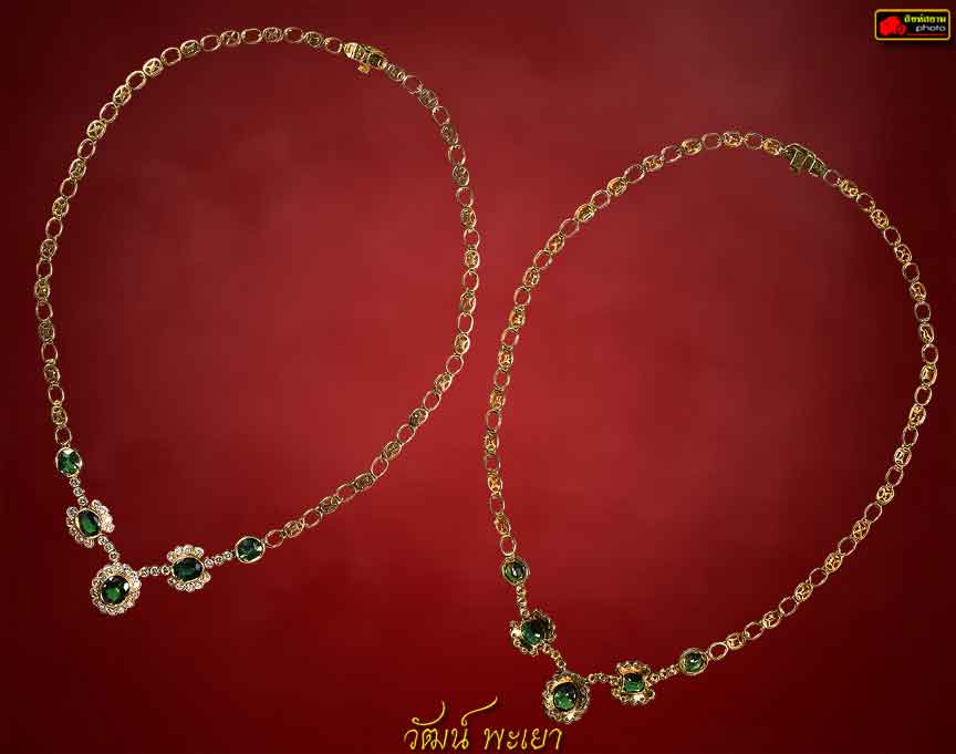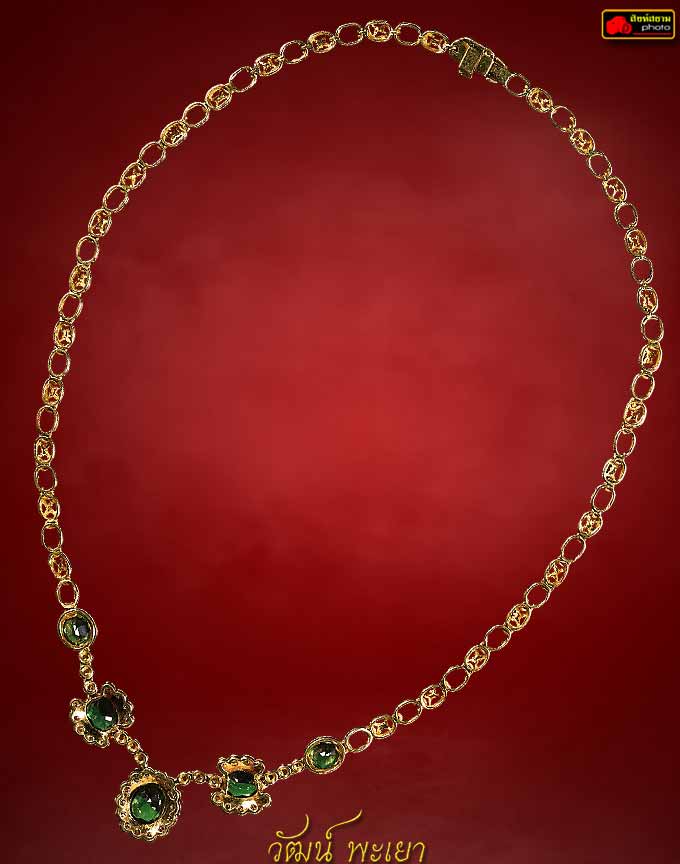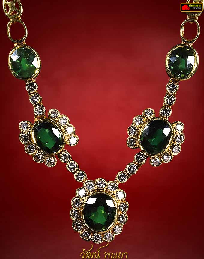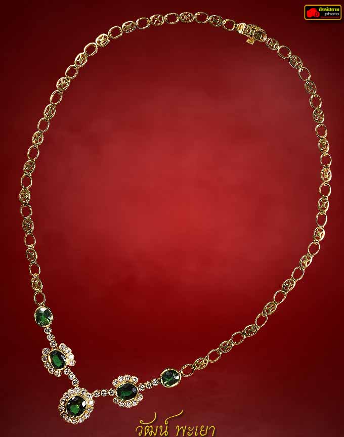 สร้อยคอพลอยบ่อบางกะจะล้อมเพชร พลอยเขียวส่อง 5 เม็ด ( เม็ดใหญ่ ) เม็ดกลาง 7X8 มิล อีก 4 เม็ด ประมาณ 6X8 มิล เพชรเกสรเบลเยี่ยมคัท เม็ด 3 ตัง 44 เม็ด ตัวเรือนทองคำ 81% น้ำหนักรวม 24.49 กรัม