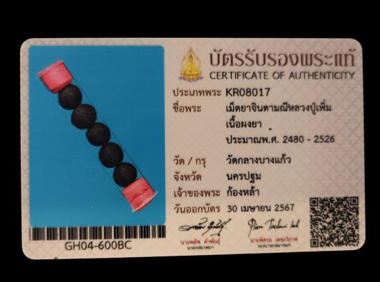 เม็ดยาจินดามณีหลวงปู่เพิ่ม วัดกลางบางแก้ว มาพร้อมบัตรรับรองสมาคม