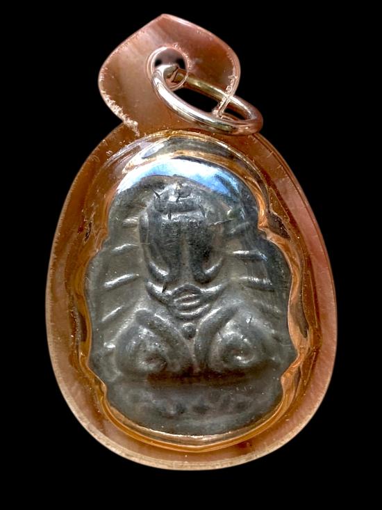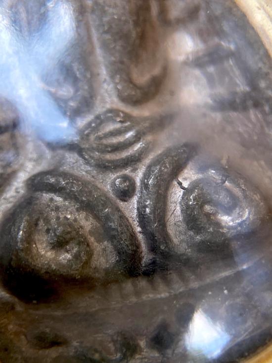 พระปิดตาเจ้าคุณผลวัดหนังกรุงเทพ พิมพ์รัศมี(หายาก) เนื้อชินตะกั่วผสมชนวนเก่า ปี2509 ด้านหลังมีจารยันต์สวยครับ