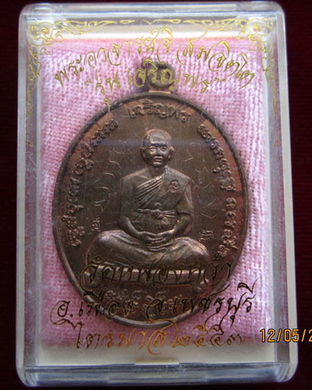 "วัดใจ" เหรียญเจริญพร พระอาจารย์จิ วัดหนองหว้า จ.เพชบุรี พ.ศ.2553 เนื้อนวะโลหะ สภาพสวยเดิม มีจารทั้งหน้าและหลัง ตอกโค๊ตและหมายเลขกำกับชัดเจน หมายเลข 288 พร้อมกล่องเดิม