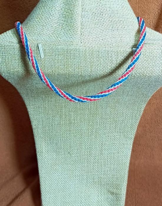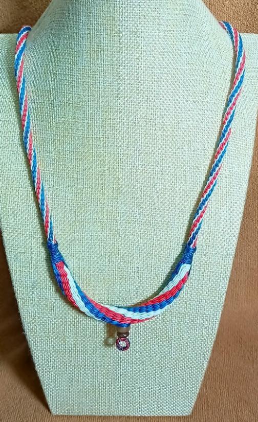 สร้อยคอเชือกเทียน งานถักมือ ( สีลายธงชาติไทย แซมลูกปัด ห้อยพระ 1 องค์ ) ยาว 24 นิ้วครับ |