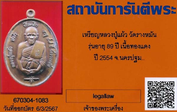 หลวงปู่แผ้ว รุ่น ๘๙ ปี วัดรางหมัน นครปฐม+บัตรรับรองพระแท้อ่านรายละเอียดพระเครื่องเพิ่มเติมและขอเชิญท่านพบกับมิติใหม่ในการเช่าบูชาพระเครื่องได้ที่ www.nutphit.com