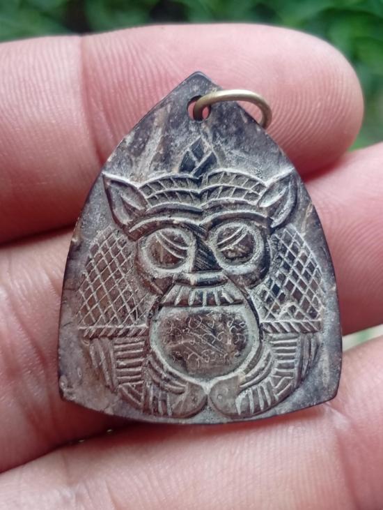 >> ราหูกะละตาเดียวแกะ ศิลป์ช่างเวียงจันทร์(ช่างลาว) มีรอยุจารหน้า-หลัง ขนาด 2.5x3.5 cm. เจาะรูใส่ห่วงทองเหลือง เก็บเกา ผิวหิ้งไม่ผ่านการใช้ สมบูรณ์ 100%