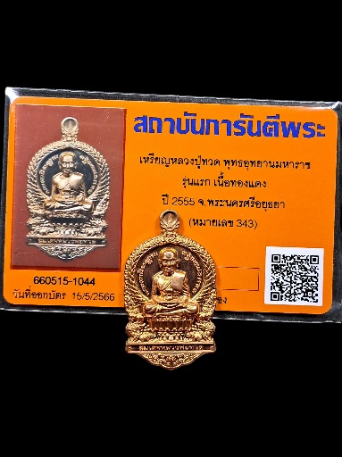 เหรียญหลวงปู่ทวด พุทธอุทยานมหาราช (รุ่นแรก) เนื้อทองแดงปี 2555 จังหวัดพระนครศรีอยุธยา หมายเลขสวยงาม 343 พร้อมบัตรเว็บจี |