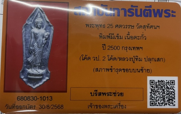 พระพุทธ 25 ศตวรรษ พิมพ์มีเข็ม (นิยม) เนื้อชินตะกั่ว ปี 2500 จ.กรุงเทพ ตอกโค้ด วป.2 โค้ด พร้อมบัตรรับรอง