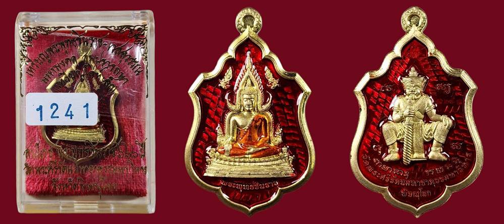 ( เลข 1241 ) เหรียญโล่ห์พระพุทธชินราช หลังยันต์วิเศษอกเลาโภคทรัพย์ เนื้อทองทิพย์ลงยาสีแดง รุ่น สมโภชพระพุทธชินราช ครบ ๖๖๖ ปี |
