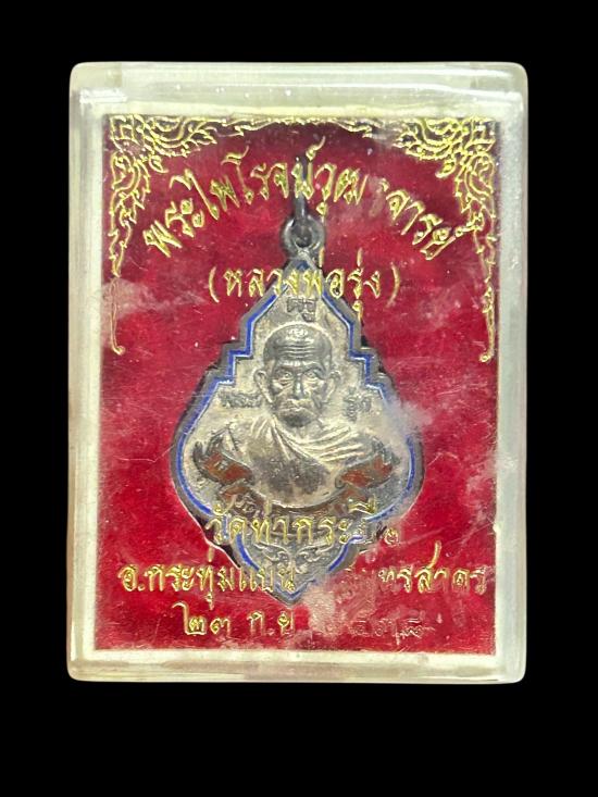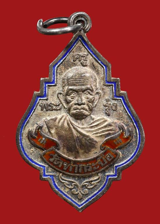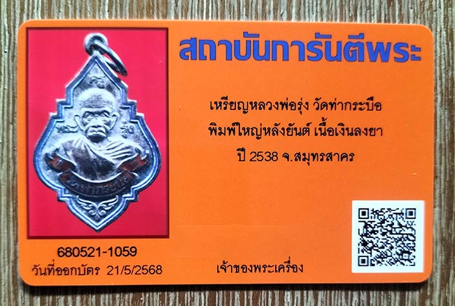 เหรียญหลวงพ่อรุ่ง วัดท่ากระบือ พิมพ์ใหญ่หลังยันต์ เนื้อเงินลงยา ปี 2538 จ.สมุทรสาคร พร้อมบัตรรับรองและกล่องเดิม |