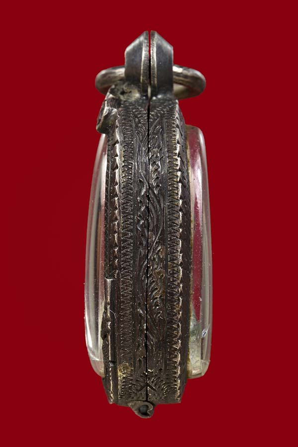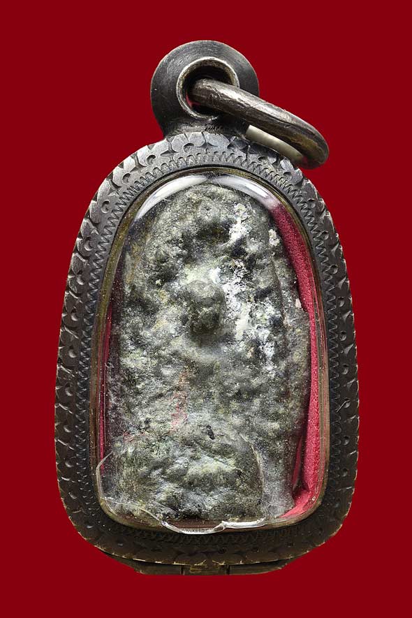 พระรอด 2 หน้า เนื้อชินเขียวกรุพะเยา มีคราบไข ปานดำ พร้อมกรอบเงินแท้