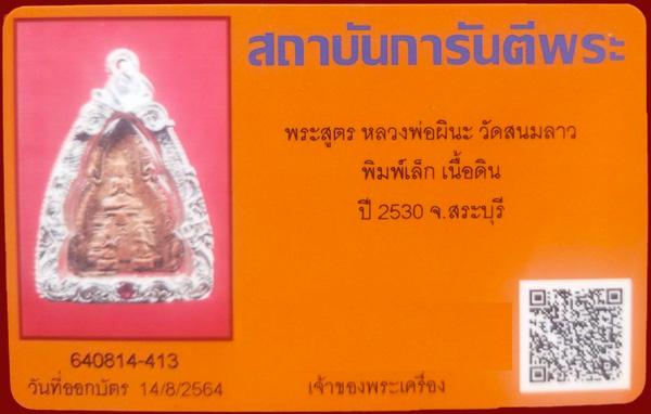 พระสูตรพิมพ์เล็ก ปี พ.ศ. 2530 หลวงพ่อผินะ วัดสนมลาว (เลี่ยมเงิน พร้อมบัตร)