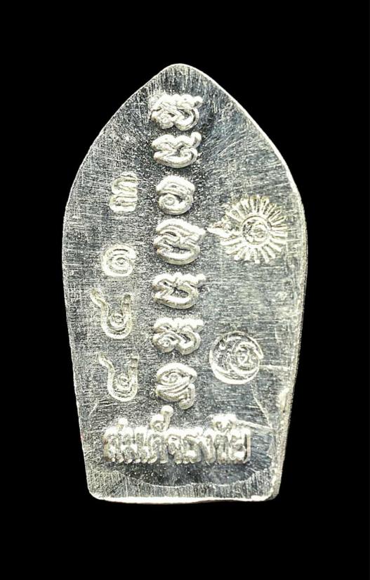 -ด้านหลัง มีพระคาถาพรมงคล ๗ ตัว "สะ ธะ วิ ปิ ปะ สะ อุ"คือ ยันต์หัวใจโพชฌงค์ ๗ ใช้ได้สารพัด ดีทุกด้าน