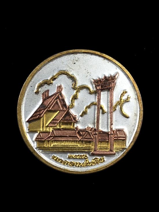 ด้านหลัง เป็นสัญลักษณ์รูปเสาชิงช้าอันเป็นเครื่องเชื่อมโยงถึงความผูกพันแต่ครั้งอดีตระหว่างโบสถ์พราหมณ์และวัดสุทัศน์